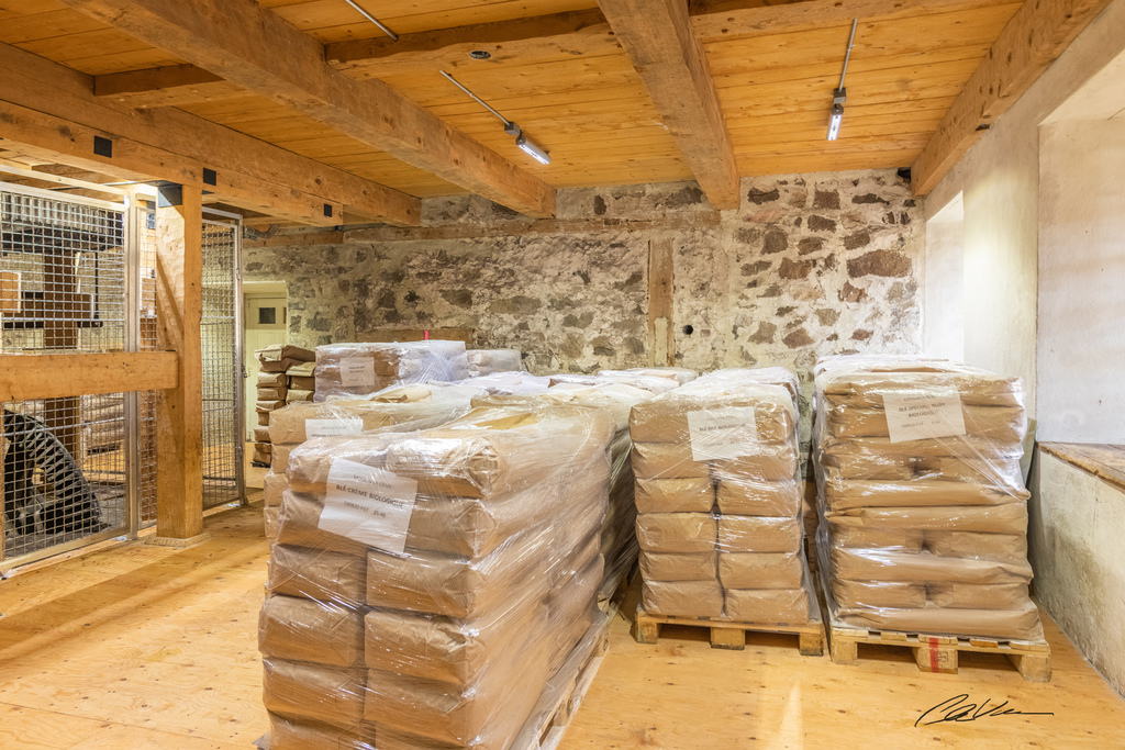 Grinding on stone grinds makes it possible to preserve the germ and the layer with aleurone, the parts richest in nutritive elements (vitamins E and of group B, minerals such as zinc, magnesium, iron, unsatured fatty acids...), on all flours.